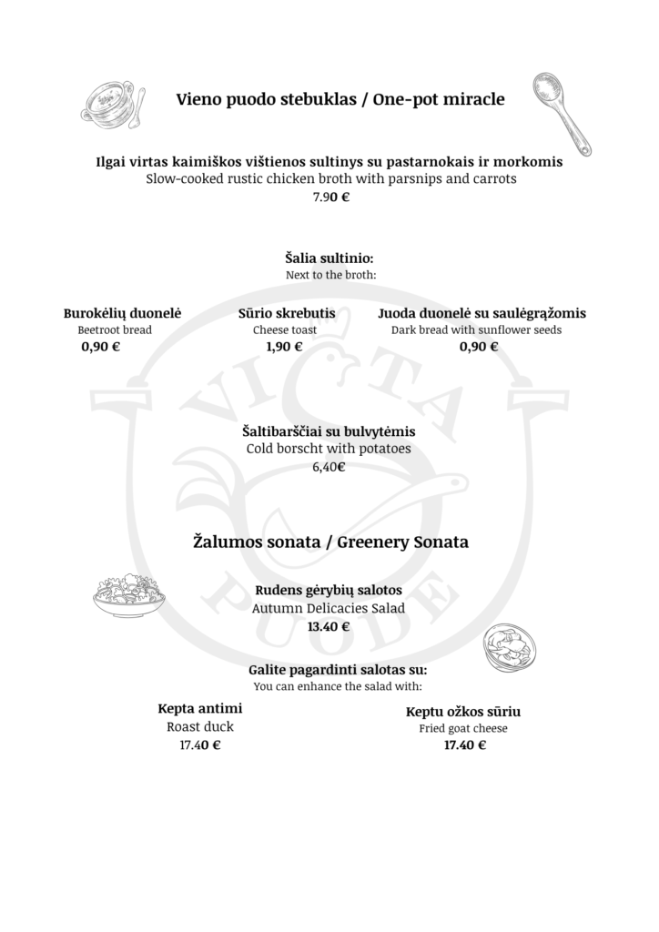 Yra metas, kai sezonas pats diktuoja pokyčius. Mes jo nekuriame – mes jo klausome. „Višta Puode“ meniu atsinaujina tada, kai produktai pasiekia savo geriausią formą. Sezoniška – nes tikime tuo, kas auga dabar. Meistriška – nes kiekvienas derinys gimsta iš patirties ir tikslumo. Modernu – nes tradiciją visada lydime šiandienos žvilgsniu. Nauji patiekalai jau atranda… Daugiau